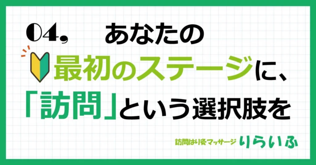 お身体が不自由になってしまった患者様にとって、マッサージを受けたいのに、外に出られないために施術を受けられない、というのは悩みの種になりがちです。