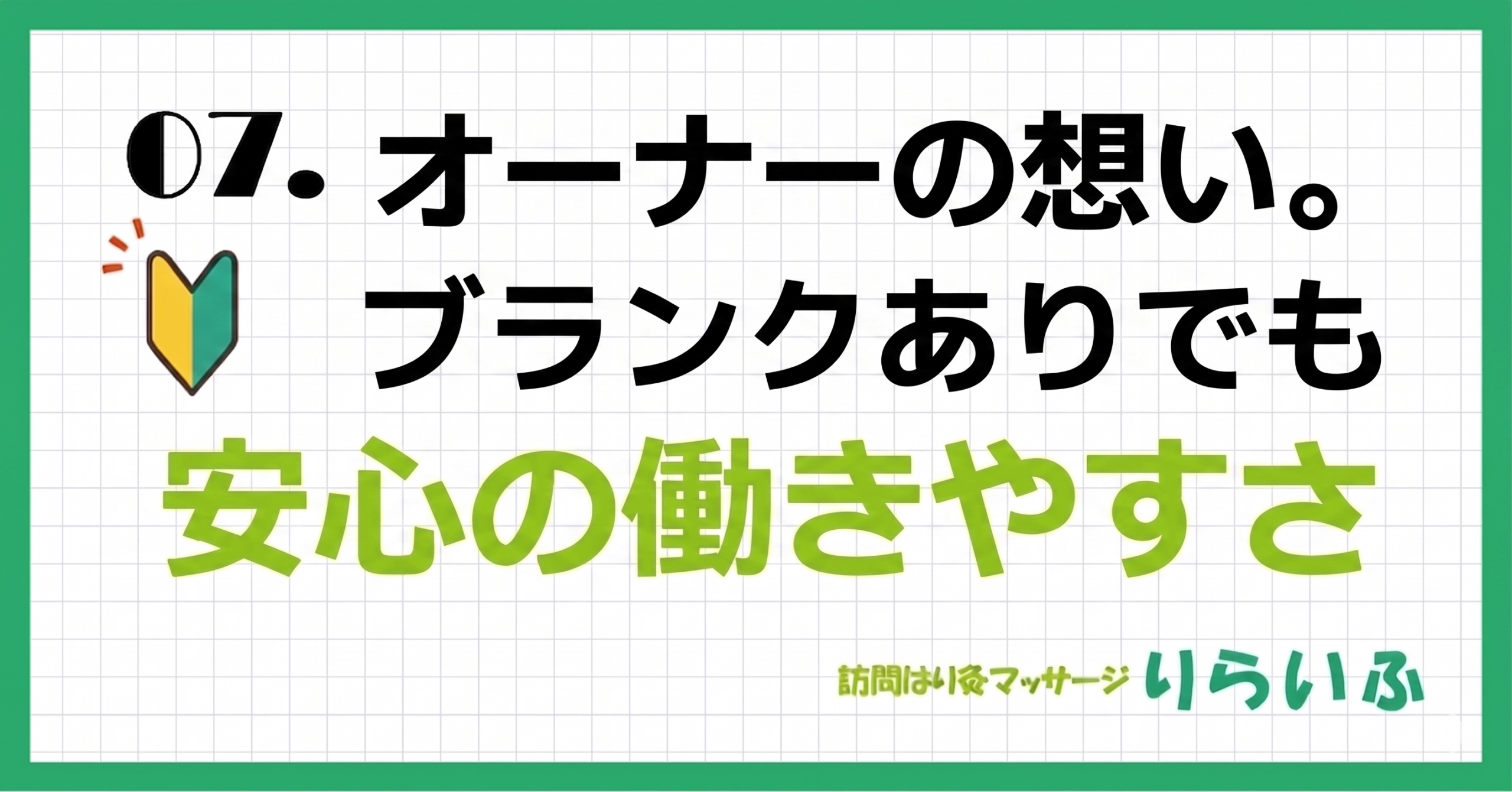 訪問マッサージのお仕事は現場では1人ですが、だからこそ事業所に帰ってきたときの「ホッとできる空間」が何より重要だと考えています。理不尽な上下関係や、相談しにくいピリピリした雰囲気は一切作りません。「今日、〇〇の現場でこんなことがあって…」と、些細な悩みや嬉しかったことを気軽に共有し合える、温かいチームをお約束します。